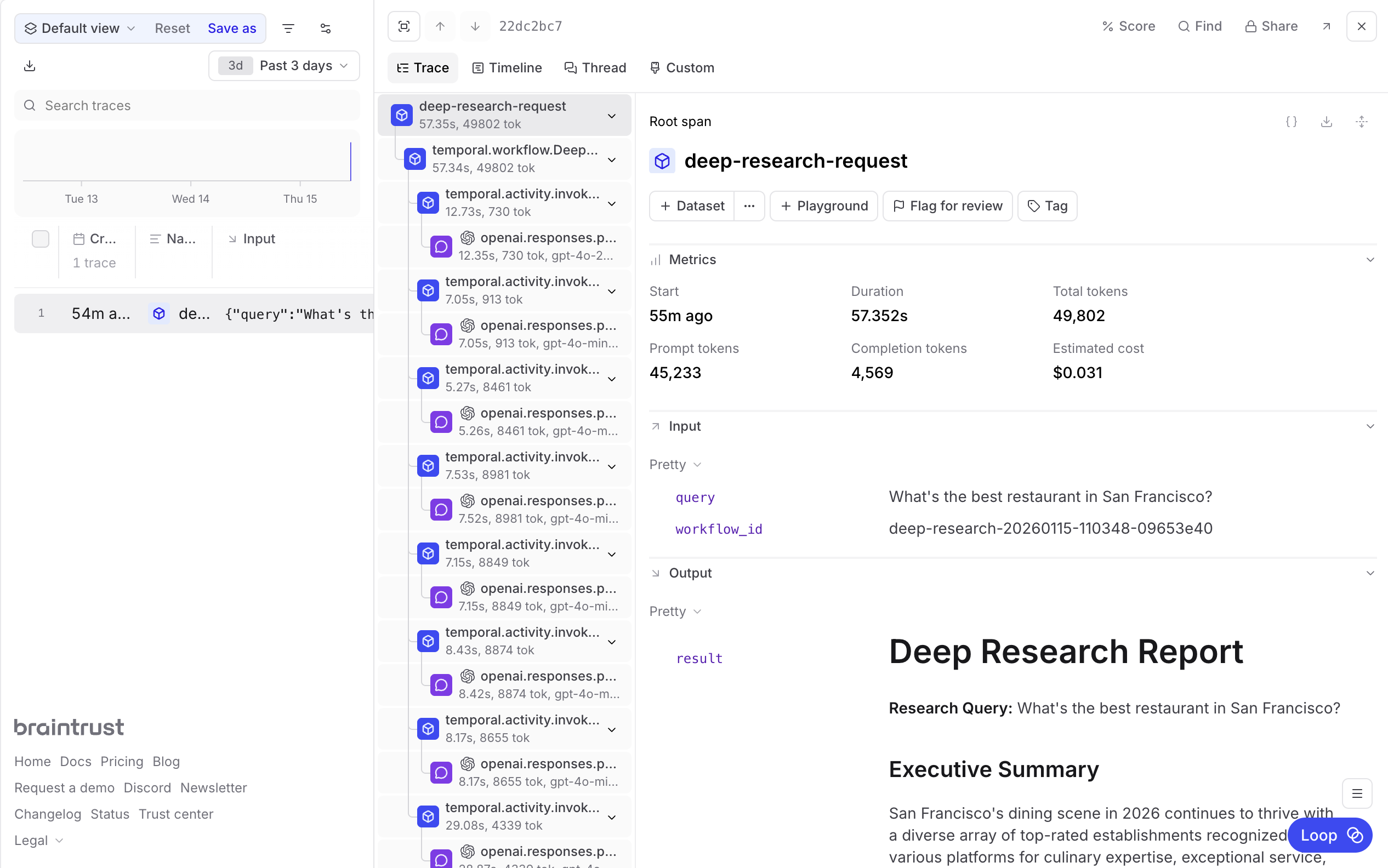 Every Workflow execution now appears in Braintrust with full hierarchy.