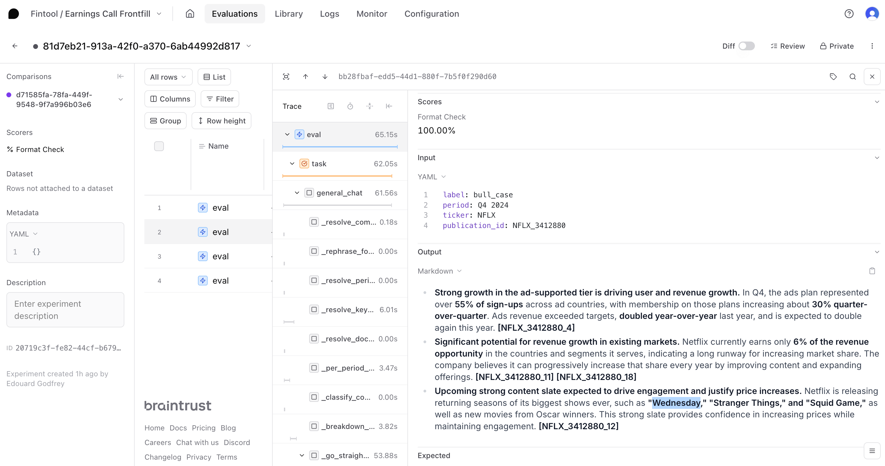 They don’t just check that sources are included. They also make sure they’re valid, properly formatted, and tied directly to the insights. The team set up custom rules in Braintrust, like requiring SEC IDs and double-checking quoted text, and real-time monitoring catches anything that doesn’t meet the standards.